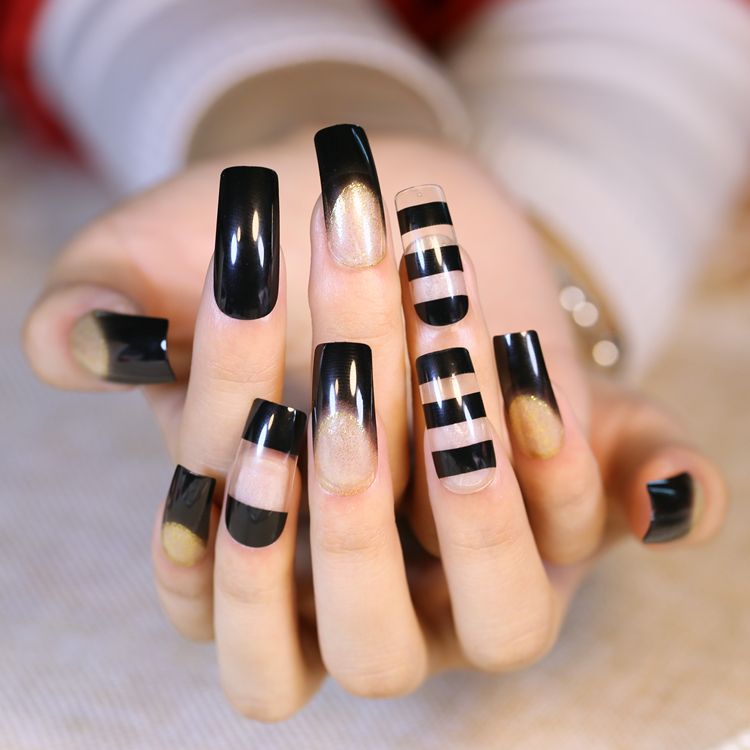 Hollow Acrylic Tips Kawaii Fake Nails With Golden Glitter Black Transparent Glitter Long Square Head Full Cover Soft From Longxing03 3 17 Dhgate Com